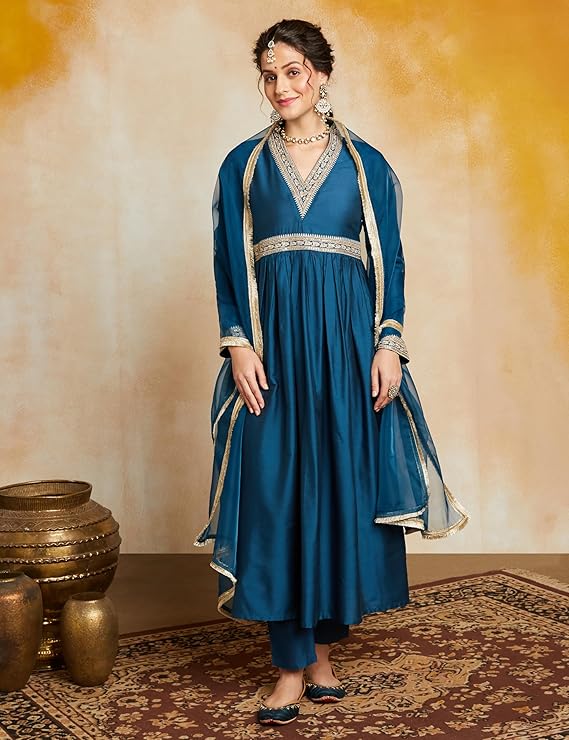 Amazon Brand – Myx Women’s Embroidered Anarkali Kurta Set with Organza Dupatta | Available in Plus Sizes